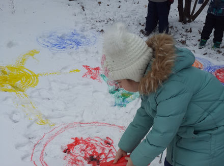 в результате рисования «необычными красками», на белом снегу появляются веселые картинки.